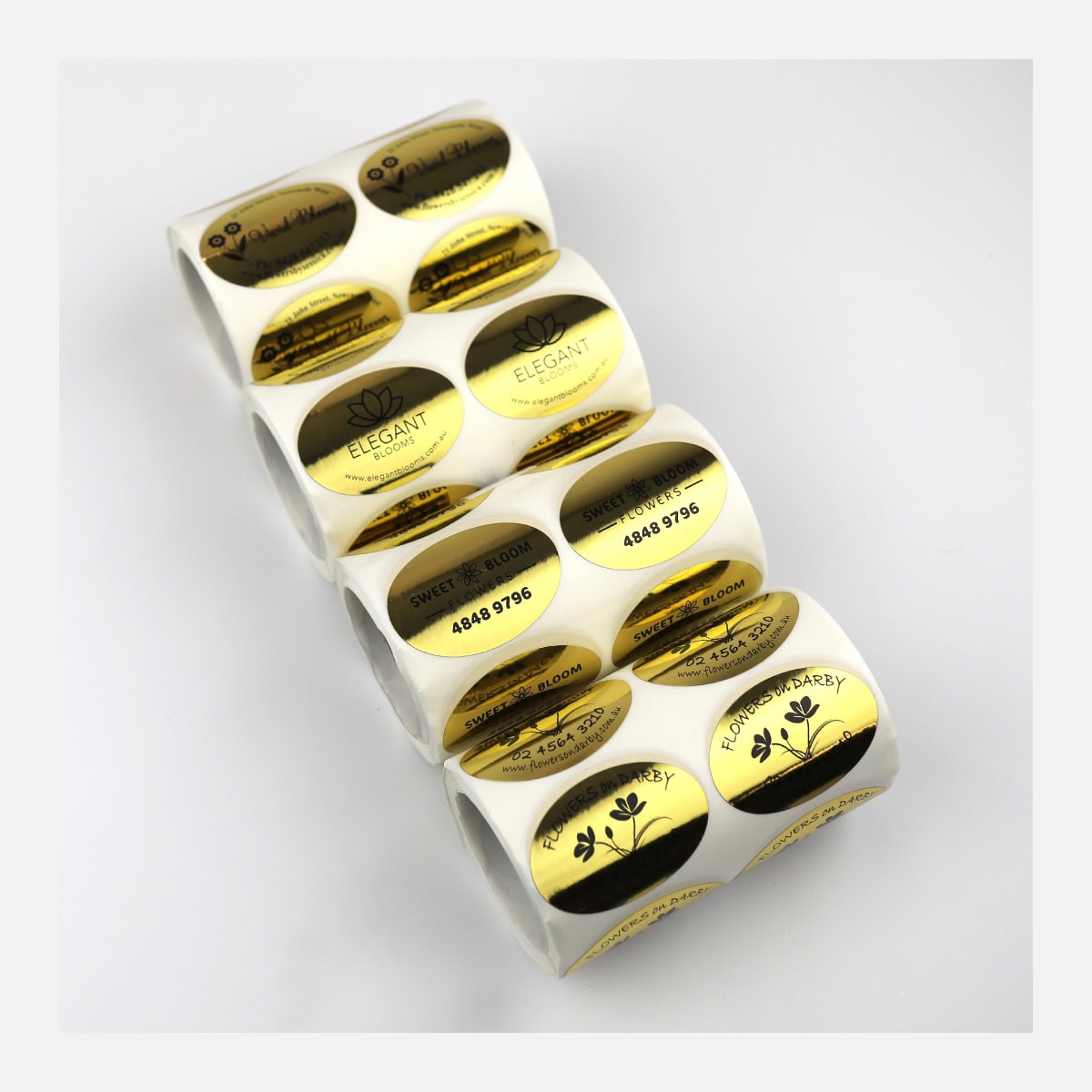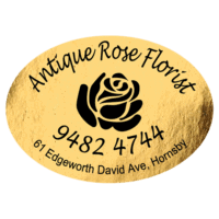 Gold & Silver Oval Custom Florist Labels are metallic-look self-adhesive labels designed to enhance floral packaging with a premium finish. These labels feature a classic oval shape and refined gold or silver appearance, making them ideal for bouquets, gift boxes and luxury floral presentations. Gold and silver oval florist labels add a subtle touch of luxury to bouquets, giftboxes and floral packaging – fully customised with your logo and design.