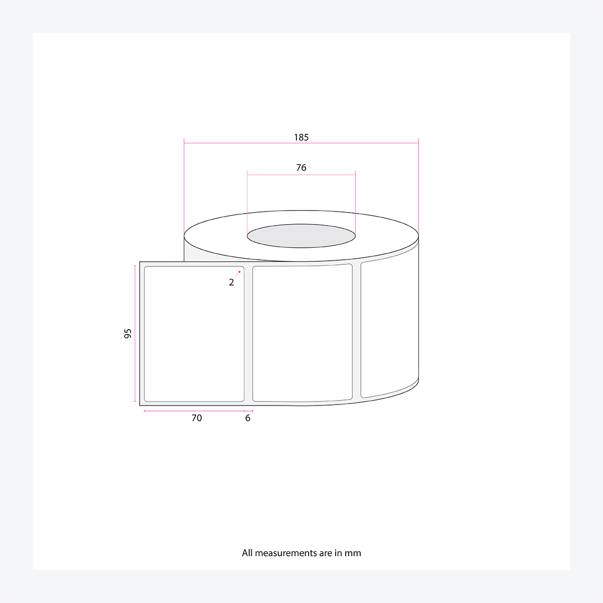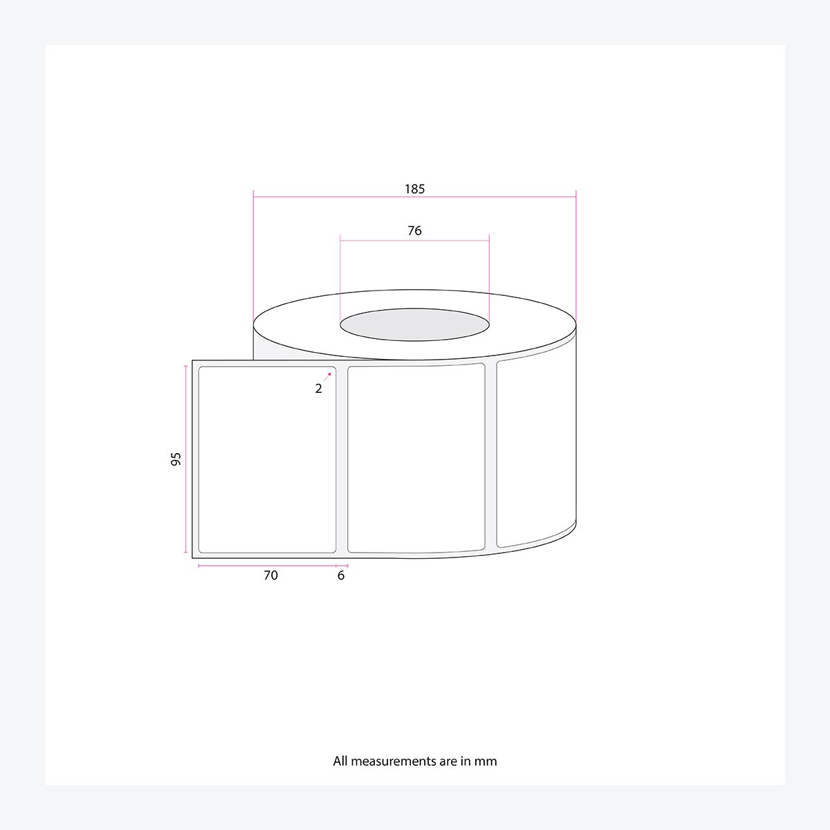 White Synthetic Self-Adhesive Labels 95x70mm are synthetic thermal transfer label rolls for durable printing of pricing, barcodes, and plant or product information. They feature a permanent aggressive adhesive for waterproof indoor and outdoor use, are supplied one per view on rolls, and allow selection of quantity and print options.
